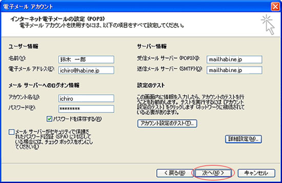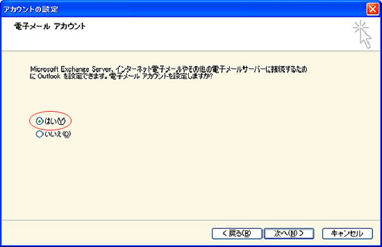 [アカウントの設定]画面が表示されますので、[はい]をチェックし、[次へ]をクリックします。