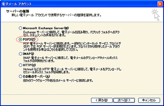 [電子メールに使用する接続の種類を選択します。]は、下記の表を参照し、お客さまの接続方法に合わせて設定し、[OK] をクリックします。
