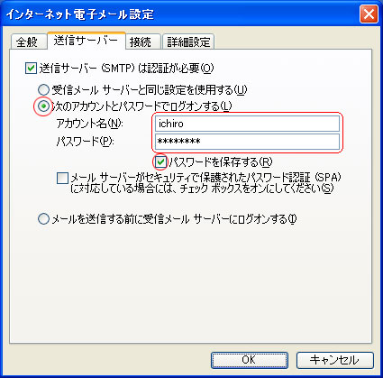 [送信サーバー(SMTP)は認証が必要]をチェックし、 [次のアカウントとパスワードでログオンする]もチェックします。 すぐ下の項目に以下のように入力し、[OK]をクリックします。
