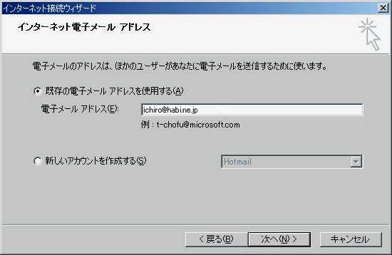 [既存の電子メールアドレスを使用する]を選び、[電子メールアドレス]に加入書に記述されているメールアドレスを入力して[次へ]をクリックします。