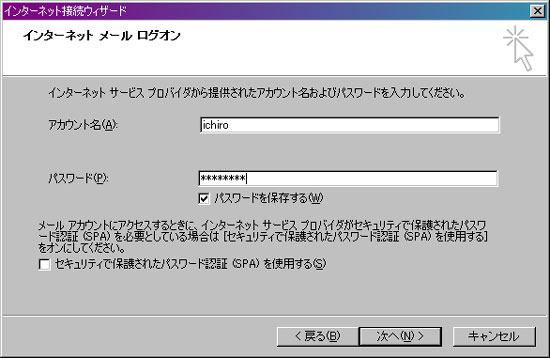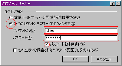 [次のアカウントとパスワードでログオンする]を選択し、以下のように、各項目を入力し、[OK]をクリックします。
