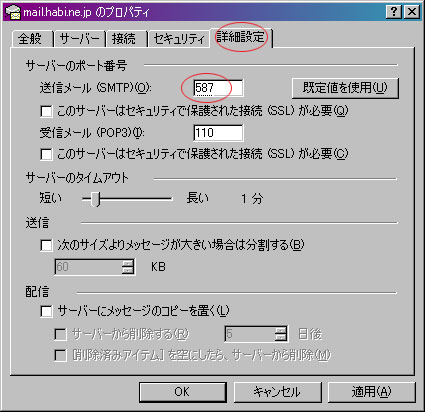 [詳細設定]タブをクリックします。 [送信メール(SMTP)]を 587 と修正します。