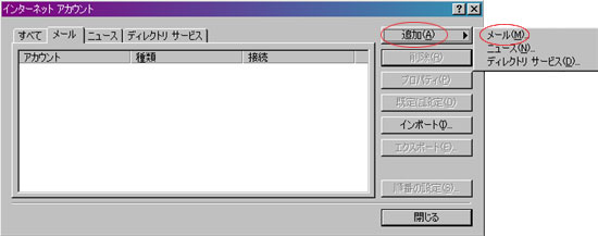 [インターネットアカウント]画面が表示されますので、[メール]のタブを開き、右上の[追加]ボタンをクリックして、その中の[メール]を選択します。