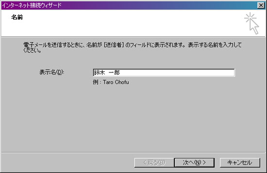 [表示名]は個人名、会社名など任意の名前を入力し、[次へ]をクリックします。ここで入力した表示名は、メール送信時に送信者名として表示されます。