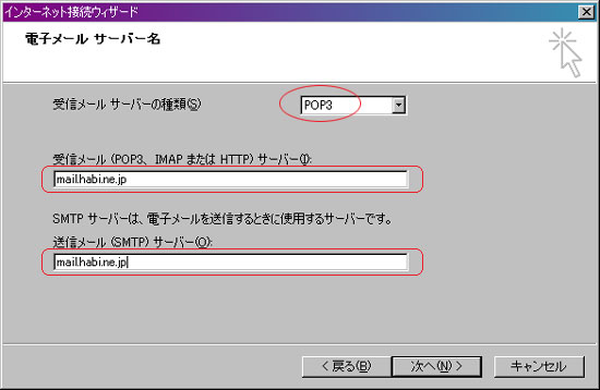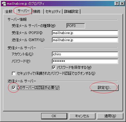 [サーバー]タブをクリックします。下記の表を参照し、各項目が正しく入力されているかを確認します。