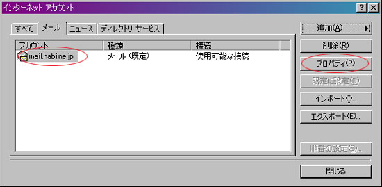 「インターネットアカウント」にHaBIのアカウントが作成されていることを確認し、そのアカウントを選択し、「プロパティ」をクリックします。