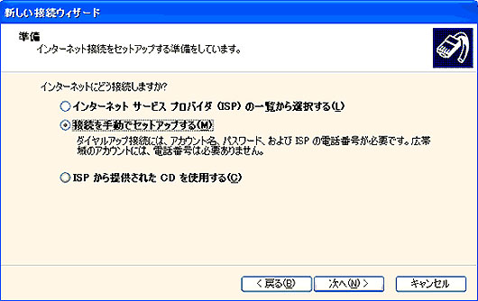 [接続を手動でセットアップする]を選択し、[次へ]をクリックします。