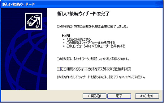 新しい接続ウィザードの完了]画面で、[完了]をクリックする。