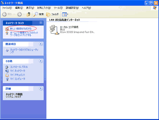 表示された下記画面にて[ネットワークタスク] 内の [新しい接続を作成する] をクリックします。