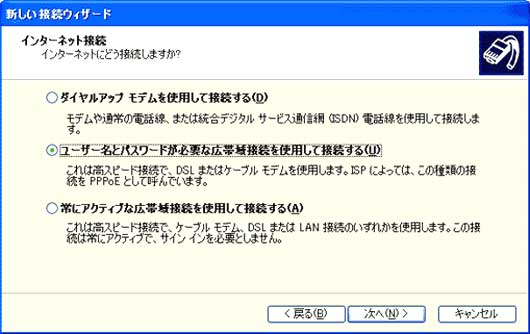 [ユーザー名とパスワードが必要な広帯域接続を使用して接続する]を選択し、[次へ]ボタンをクリックする。